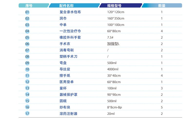 適用于介入手術,產(chǎn)品主要由高性能無紡布制成的包布、洞巾、一次性治療巾、醫(yī)用墊和導絲盆、量杯、彎盤、器械保護罩等配件組合而成,可根據(jù)臨床需要更改介入包內(nèi)配件數(shù)量,增加開洞數(shù)量、配備具有更高防護等級的吸液層,強化手術關鍵區(qū)域的阻隔能力。