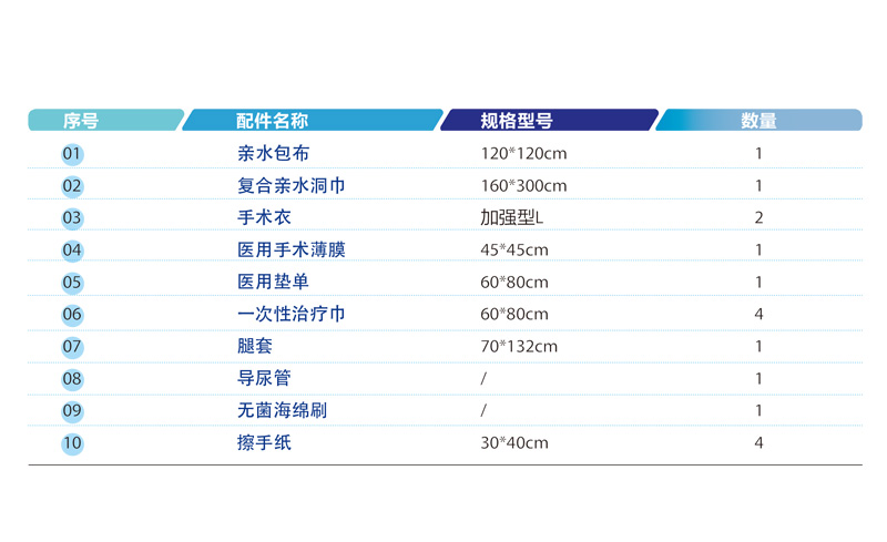 適用于泌尿外科等結(jié)石位手術(shù),產(chǎn)品主要由高性能無紡布制成的器械臺(tái)布、洞巾、一次性治療巾、手術(shù)衣等配件組合而成,可根據(jù)臨床需要更改手術(shù)包內(nèi)配件數(shù)量,配備具有更高防護(hù)等級的吸液層或積液袋,強(qiáng)化手術(shù)關(guān)鍵區(qū)域的阻隔能力。